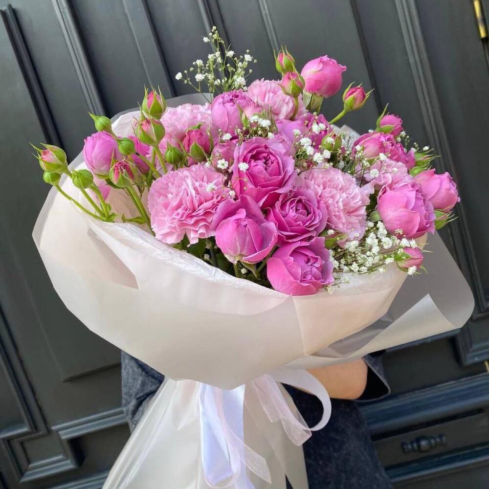 Пионовидные розы Мисти Баблс, диантус розовый и гипсофила в Эртиле
